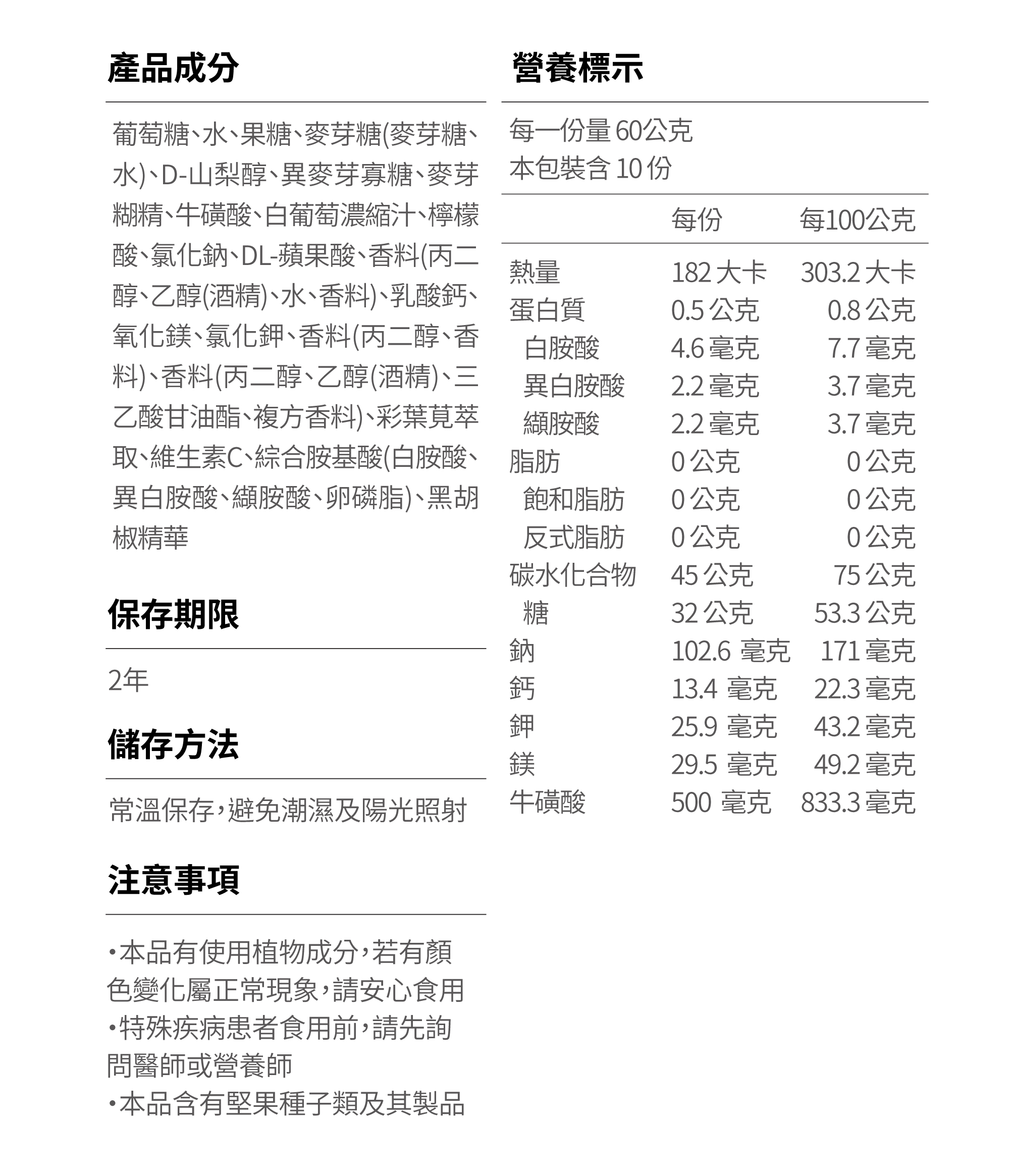 ・電解質5顆鹽錠含量!省去補充鹽錠的麻煩:鉀、鈣、鈉、鎂,有助於減緩在運動中因大量流汗,而產生的不適現象,維持身體機能上穩定。